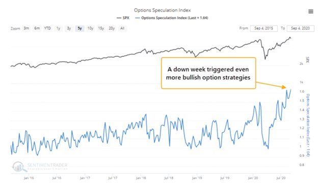 El volumen de apuestas alcistas en la bolsa de los Estados Unidos es 10 veces más grande que aquel del clímax de especulación del año 2000. Simplemente no hay registro de un nivel especulativo similar en la historia. Esto puede medirse por el volumen destinado en la última semana a las opciones de compra: